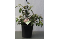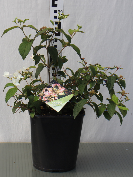 Viburnum plicatum Pinkimono® jest bardzo zwartą, wolno rosnącą kaliną, dorasta ledwie od 80 do 100 centymetrów. Krzew ma ciemnozielone liście i kwiaty, które kwitną w dużych płaskich baldachach z małymi, płodnymi kwiatami pośrodku. Piękne kwiaty zmieniają kolor z jasnoróżowego na jasnobiały.